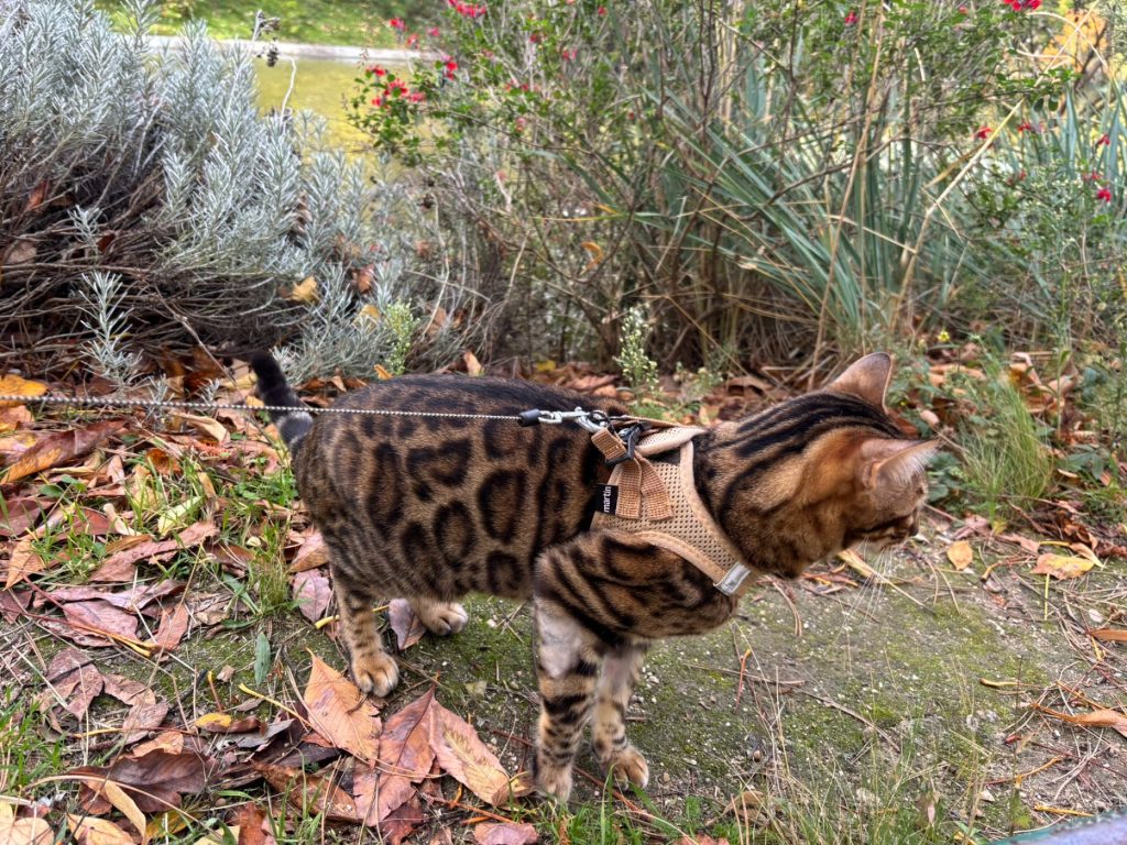 חתולה בביגוד אופנתי ועם רצועה יוצאת לטיול שבת סביב האגם בפרק מונסורי