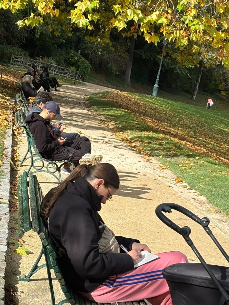 על הספסל – כותבת, מנענעת עגלת תינוק, עוצמת עיניים ומתמכרת לחום השמש ולשקט